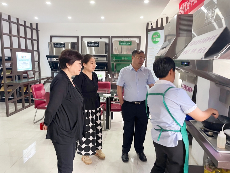 隨后,公司帶領協會領導們參觀了樣品間和展示廳。在展示廳內,市場總監何楊介紹了多環公司自主研發生產的7款“內循環油煙凈化機”專利產品,對每款產品的性能、應用場景都一一做了講解。參觀過程中,李基英副理事長和邵白秘書長與工作人員密切交流,詢問了解產品的特點,并由操作員現場演示爆炒辣椒、洋蔥,經多環公司生產的“內循環式油煙空氣凈化機”的處理,可做到不需要外接煙管直接采用吸排凈化一體的形式直接在室內就將烹飪中產生的油脂、煙顆粒物、異味、有害氣體及余熱進行了全部的凈化處理,機器排出來的就是干凈的空氣,在房間內完全聞不到辣味嗆味。協會領導看到眼前這一幕,當場對產品的性能贊不絕口。